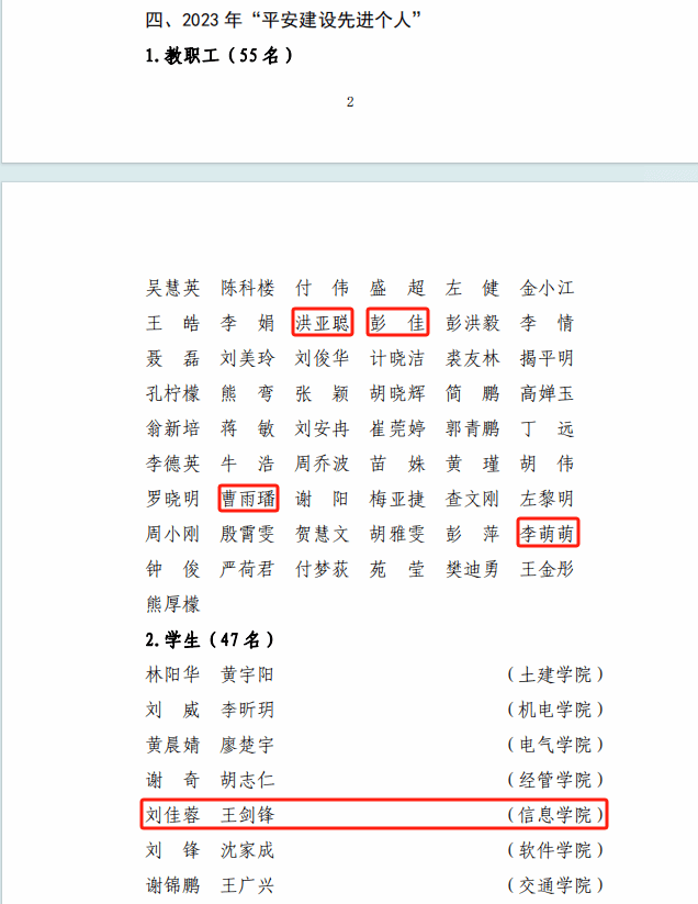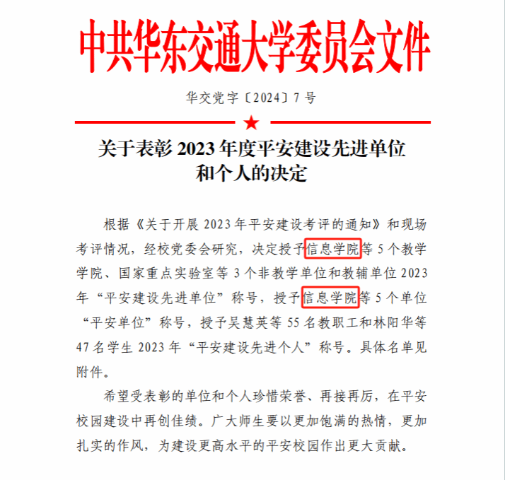 近日,校党委印发《关于表彰2023年度平安建设先进单位和个人的决定》,信息学院获评“平安建设先进单位”称号(排名第一)和“平安单位”称号(排名第一);洪亚聪等4名教职工和刘佳蓉等2名学生荣获“平安建设先进个人”。