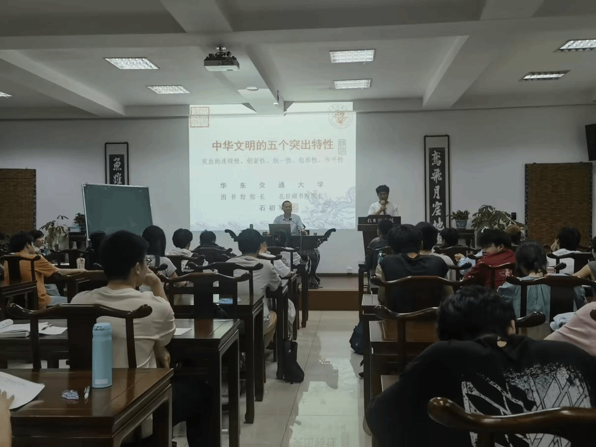 图书馆馆长、孔目湖书院院长石初军老师授课。石初军老师以深刻而生动的方式,带领参训学员深入探讨了“中华文明的五个突出特性”,为与会者呈现了一场精神与智慧的盛宴。