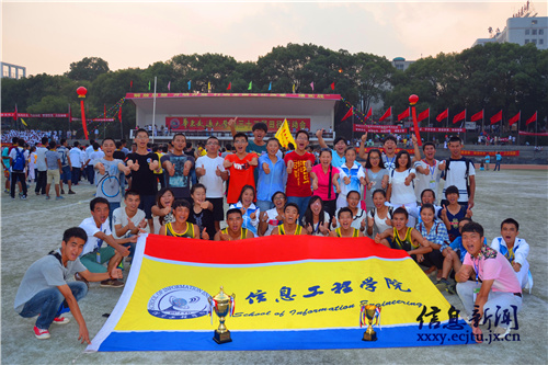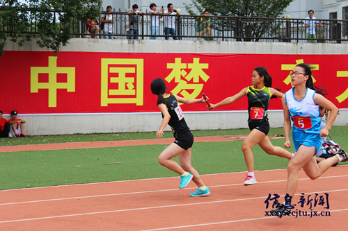 在信息四位运动健儿的努力下,信息学院取得男子4*100米接力赛第二名。