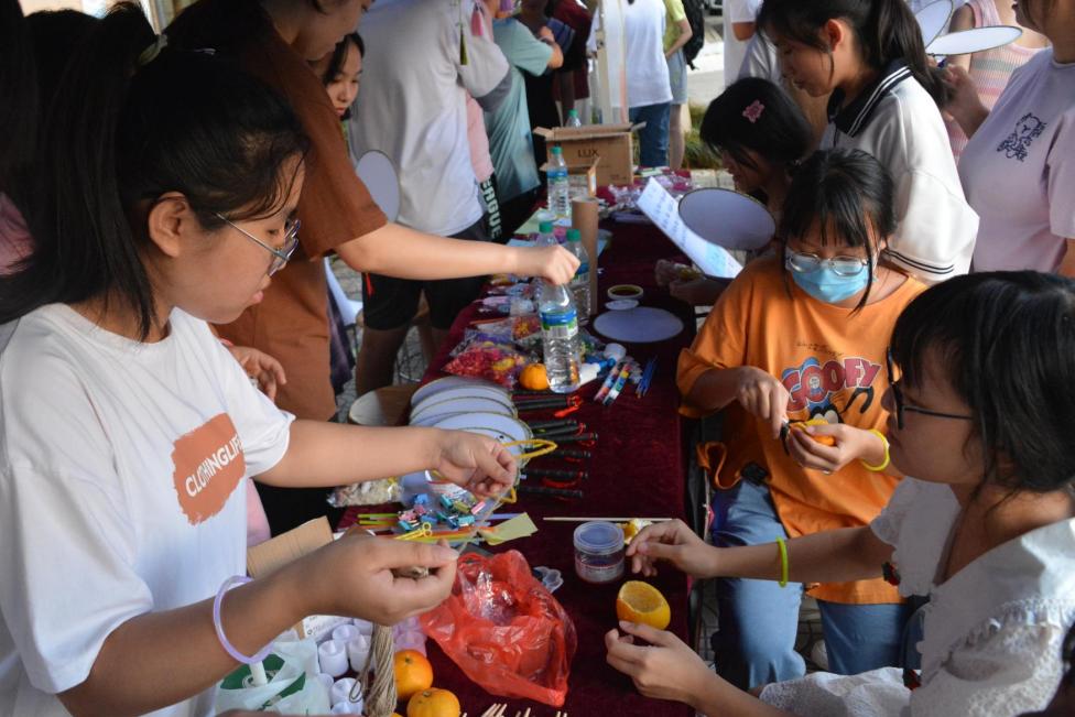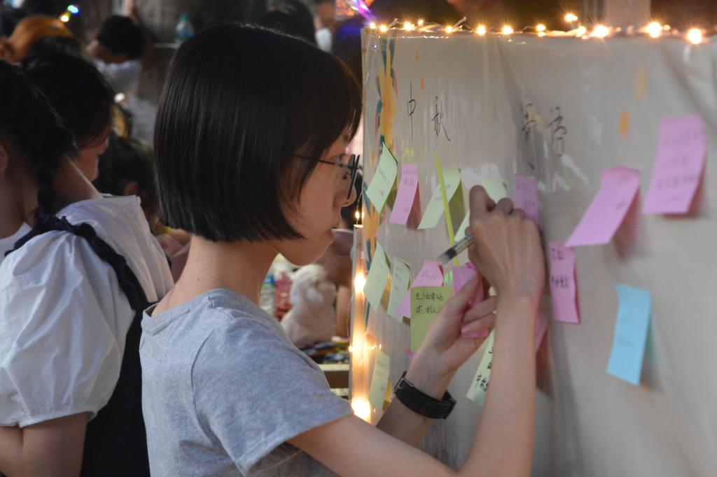 天色渐晚,圆月初升,此次活动正式开始。同学们在活动现场制作小橘灯以及团扇等精美的物品,既能够互相分享喜悦和乐趣,又能够体验到其中的文化之美。猜灯谜活动更是引来不少同学参与,谜面有猜字的,猜成语的,还有猜人名和地名的,充满趣味性与知识性。一旁的中秋留言板处,同学们亲笔写下对自己的寄语,对生活的期许,对学校的祝福以及对祖国的热爱。活动现场处处洋溢着中秋佳节的温馨气氛。