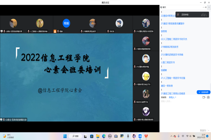 为进一步学习宣传贯彻党的二十大精神,增强班级凝聚力,提高班委为同学服务能力。11月25日,信息工程学院进行线上班委培训,学生会和团属学生组织各部门负责人进行线上培训,各班班委参加会议。