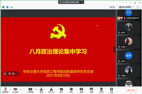 《关于2021年8月政治理论学习要点的提示》要求及信息工程学院党委的相关部署安排,8月10日,信息工程学院创新基地学生党支部组织了八月政治理论集中学习会。由于正值暑假期间,此次会议在线上进行。