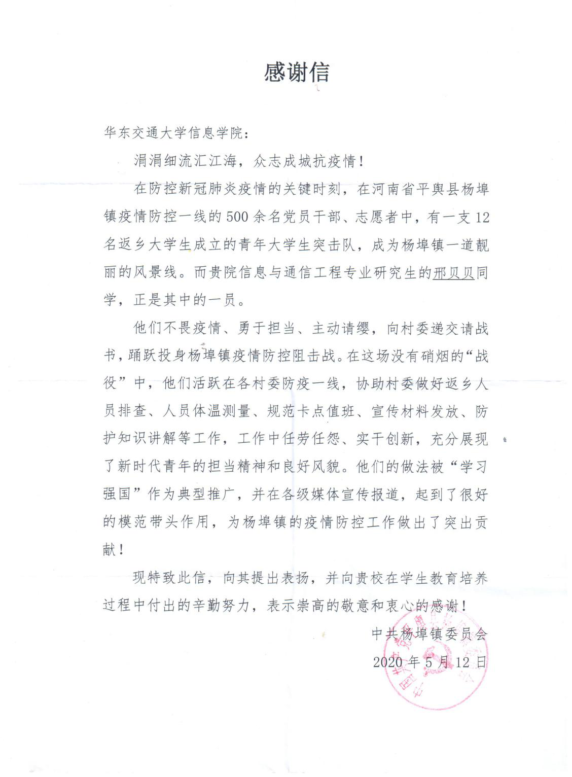 邢贝贝,来自河南省驻马店市平舆县,是信息学院信息与通信工程研究生党支部2018级研究生,在征得家人同意后,她第一时间参与了平舆县杨埠镇老任村委宣传防疫事项,为保障村民安全贡献一份力量。