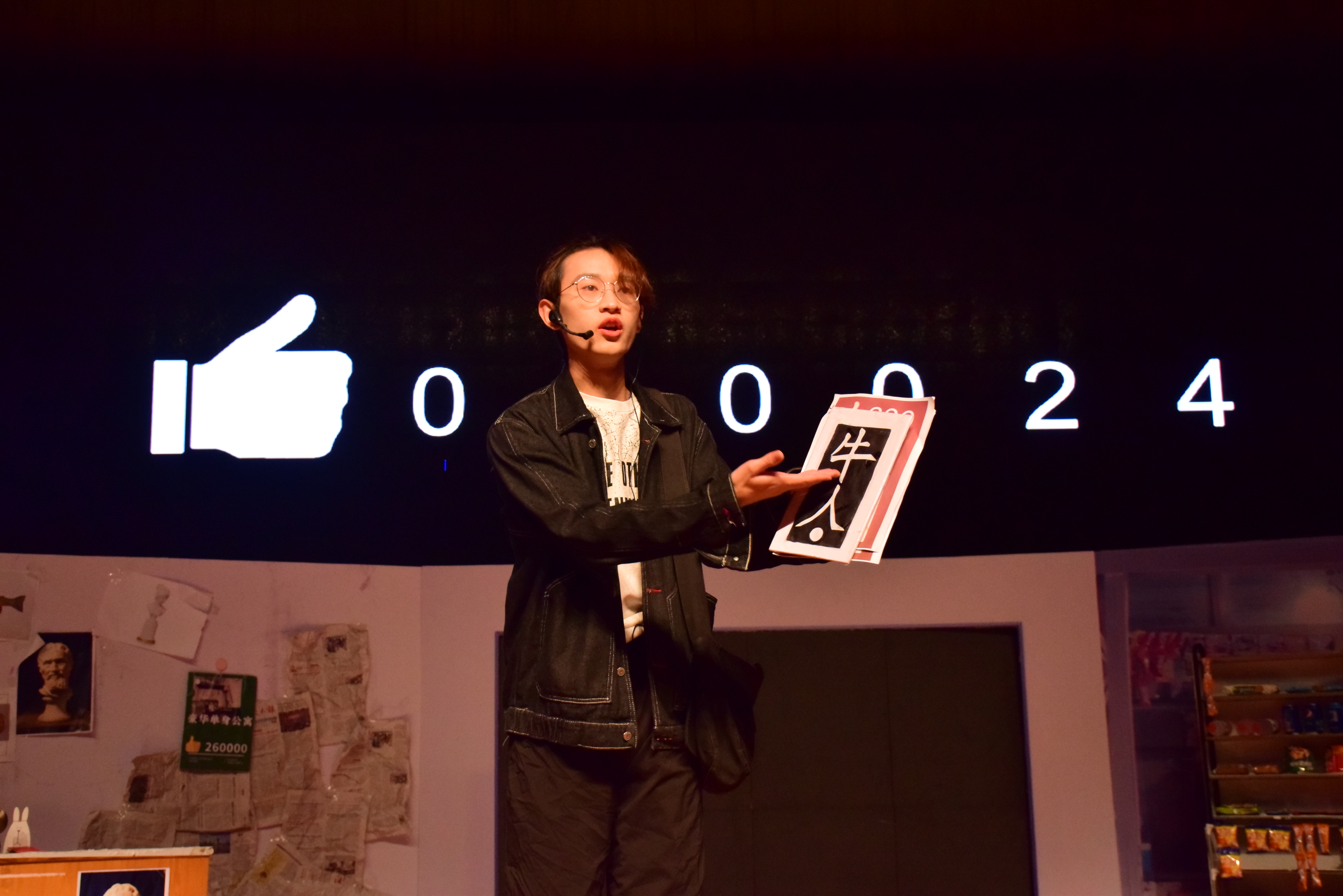 “不忘初心,方得始终”“初心不顾,功名利禄犹如浮云飞絮,风动辄衰也。”决赛现场,六大学院频出奇招、各显身手,精心设计的笑点与泪点巧妙穿插其间,为全校师生带来了一幕幕精彩的表演。其中,信息学院心理剧时间轴设定在以认同体系为核心的9012年。那时,人们的价值取决于他人的认同,社会将价值与点赞数画上等号。手工艺人赵无和千千万万为梦想奔波的年轻人一样,在这个“点赞至上”的时代,为了网络平台上他人的“赞”而绞尽脑汁。在一次次的碰壁之后,赵无没能抵挡住利益的诱惑,放弃了自己坚守的手工艺事业,将自己的作品随意施舍给了路旁乞人,而自己则开启了直播。“脚盆吃面”“嘴灭烟花”,他以一种病态的方式摧残自己、取乐大众。但事实证明,没有内涵的作秀终究只是空中楼阁,一次直播事故让赵无深受打击,赞数颓势已无可挽回,最终两手空空。