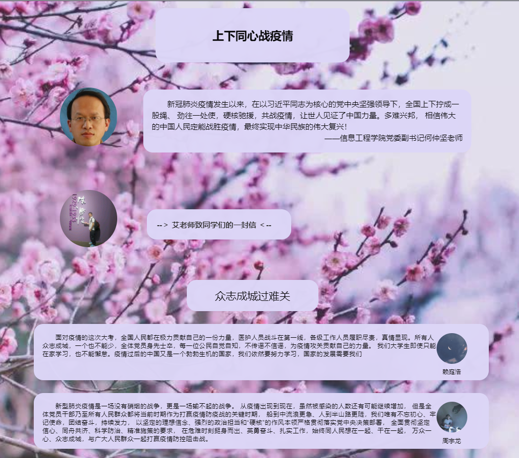 辅导员何仲坚寄语:“自新冠肺炎疫情发生以来,在以习近平同志为核心的党中央领导下,全国上下拧成一股绳,劲处一处使,硬核驰援,共战疫情,让世人见证了中国力量,多难兴邦,相信伟大的中国人民定能战胜疫情,最终实现中华民族的伟大复兴!”辅导员艾国金也表示:“面对疫情的这次大考,全国人民都在极力贡献自己的一份力量,医护人员战斗在一线,各级工作人员履职尽责,真情显现,所有人众志成城,一个也不能少,全体党员身先士卒,每一位公民自觉自知,不传谣不信谣,为疫情攻关贡献自己的力量。”