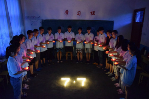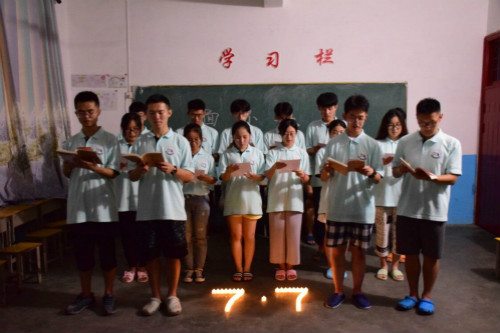 “风云恶,陆将沉,狂澜挽转在军人。扶正气,励精神,诚真正平树本根…”战歌响起,缓缓而低沉。灯光熄灭,蜡烛摆放成“7.7”的形状放在地上,调研实践团全体肃静,垂首沉思,手举蜡烛为烈士哀悼。“抗战十四年,先辈们浴血奋战换回正义。先辈抛头颅洒热血换来心幸福生活来之不易,我们要加倍珍惜。”观察团班长吴登权说道。