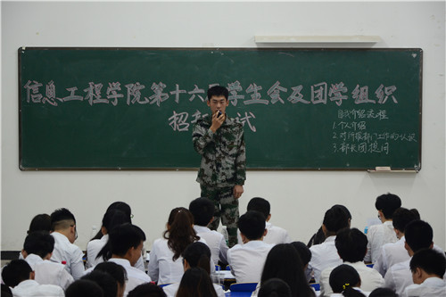 9月9日,信息学院于教14栋211室举行第十六届学生会及团学组织招新面试大会。信息学院第十六届主席团及部长团全体成员出席并担任评委。