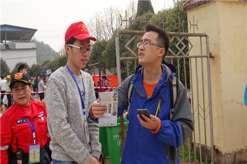 开幕式结束后,志愿者们的工作仍在进行,大约一百多个志愿者分为十组,分别为摄影组,后勤组,打卡组等;部分志愿者跟随者参赛者在路途中以防突发状况的发生,指路组负责举牌为参赛者引路。指路志愿者为了参赛人员看得清楚,双手高举牌子,一个小时过去了,汗水湿透了衣衫,嘴唇变干成白色,他们仍咬牙坚持着。山路十分难走,遇到参赛者出现不想走的状况,志愿者鼓舞道:“再坚持五分钟我们就能到达打卡点了。”给参赛者带去了希望和坚持下去的动力。参赛者到达终点后,由于山路狭窄导致堵车,很多参赛者仍在终点位置停滞。志愿者在终点为参赛人员统计时间,颁发证书,分发食物。将他们带往休息处,维持现场秩序。