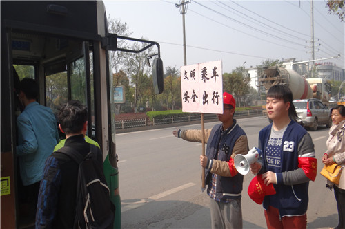 校门口处,志愿者们身披志愿者绶带,提醒行人“红灯停,绿灯行”,引导行人文明过马路。双港路公交站处,党员代表们右手佩戴志愿者臂章,高举“文明乘车,安全出行”提示牌,组织乘客排队有序上车,提示乘客注意自身财物安全。