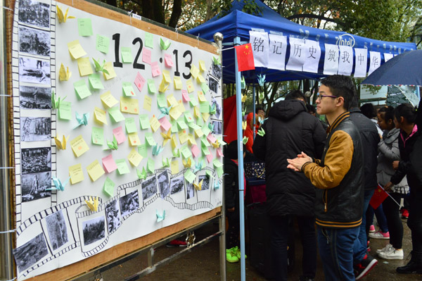 “愿世界再无战争”、“勿忘国耻,青年当自强”、“深深哀悼南京遇难同胞”……为纪念南京大屠杀死难者国家公祭日78周年,中国人民抗日战争胜利暨世界反法西斯战争胜利70周年,12月13日,91国产