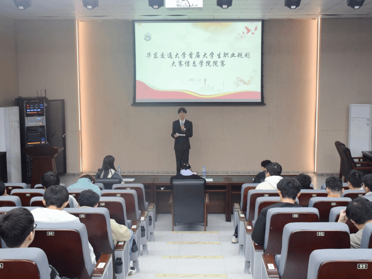 首届大学生职业规划大赛信息学院院赛。信息学院黄少逞、电气学院江雅琪、外语学院王伟峰出席本次活动并担任大赛评委。