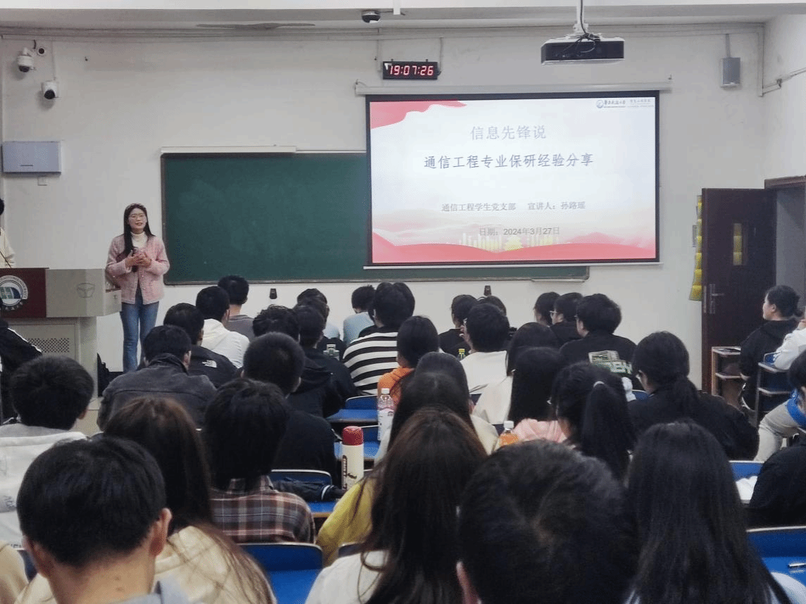 3月27日,信息工程学院通信工程学生党支部承办开展学院“信息先锋说”第二十八期交流分享会。本次分享会以保研经验分享为主题,由党支部获得推免资格的孙路瑶同志进行经验分享。信息学院通信工程2023级全体学生参会。