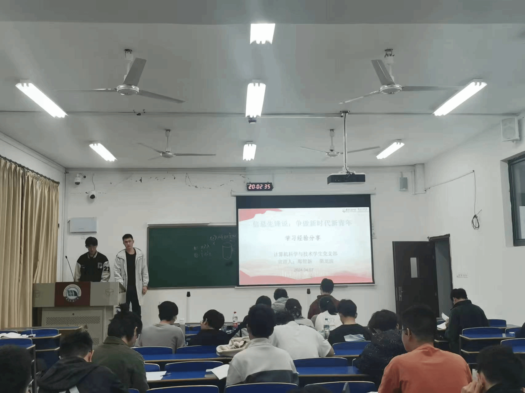 4月7日,信息工程学院举办“信息先锋说”第二十九期交流分享会,此次会议由计算机科学与技术学生党支部主持。党支部栗龙波同志和鄯智新同志围绕新生学业、生涯规划和成长成才进行分享交流。计算机科学与技术2023-3、4班全体同学参加分享会。